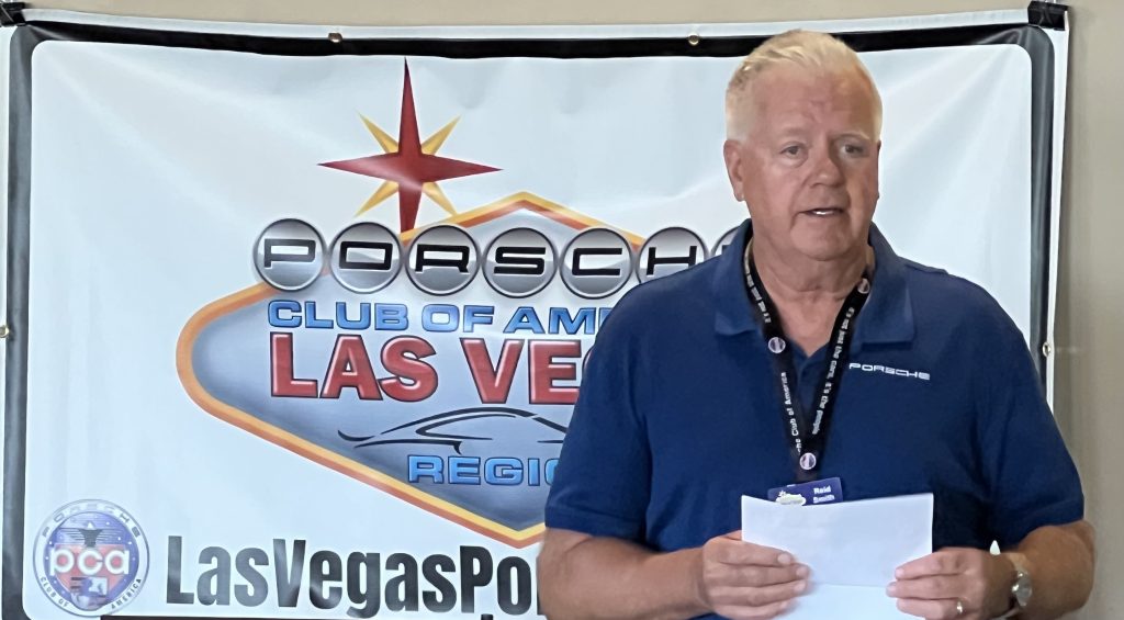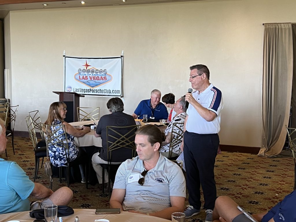 After chatting, noshing on a really good brunch including someone’s favorite cinnamon rolls, and chatting some more, President Reid Smith presented a review of upcoming events for the club including a day drive, a cocktail-optional social, special event with presentation by a noted race driver and other events (as covered in detail on our website www.lasvegasporscheclub.com and in our newsletter Desert Drives).