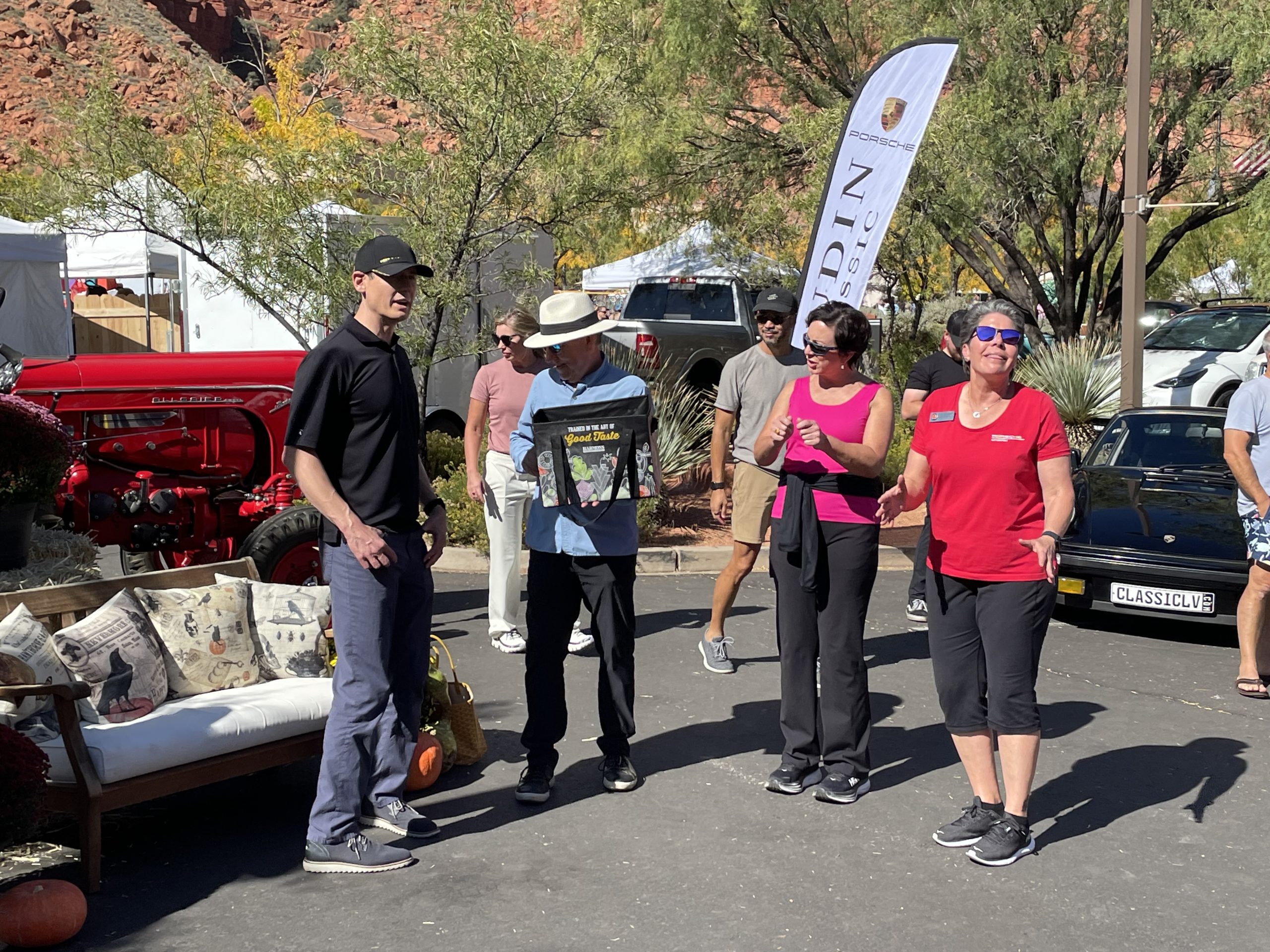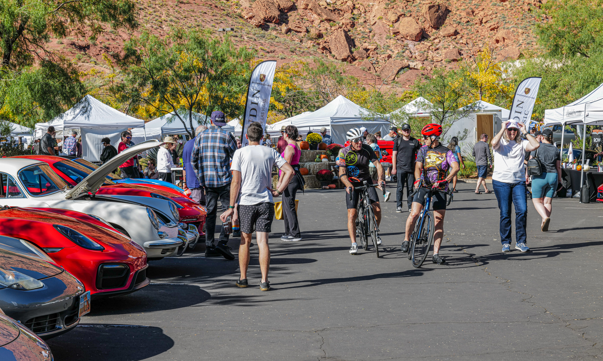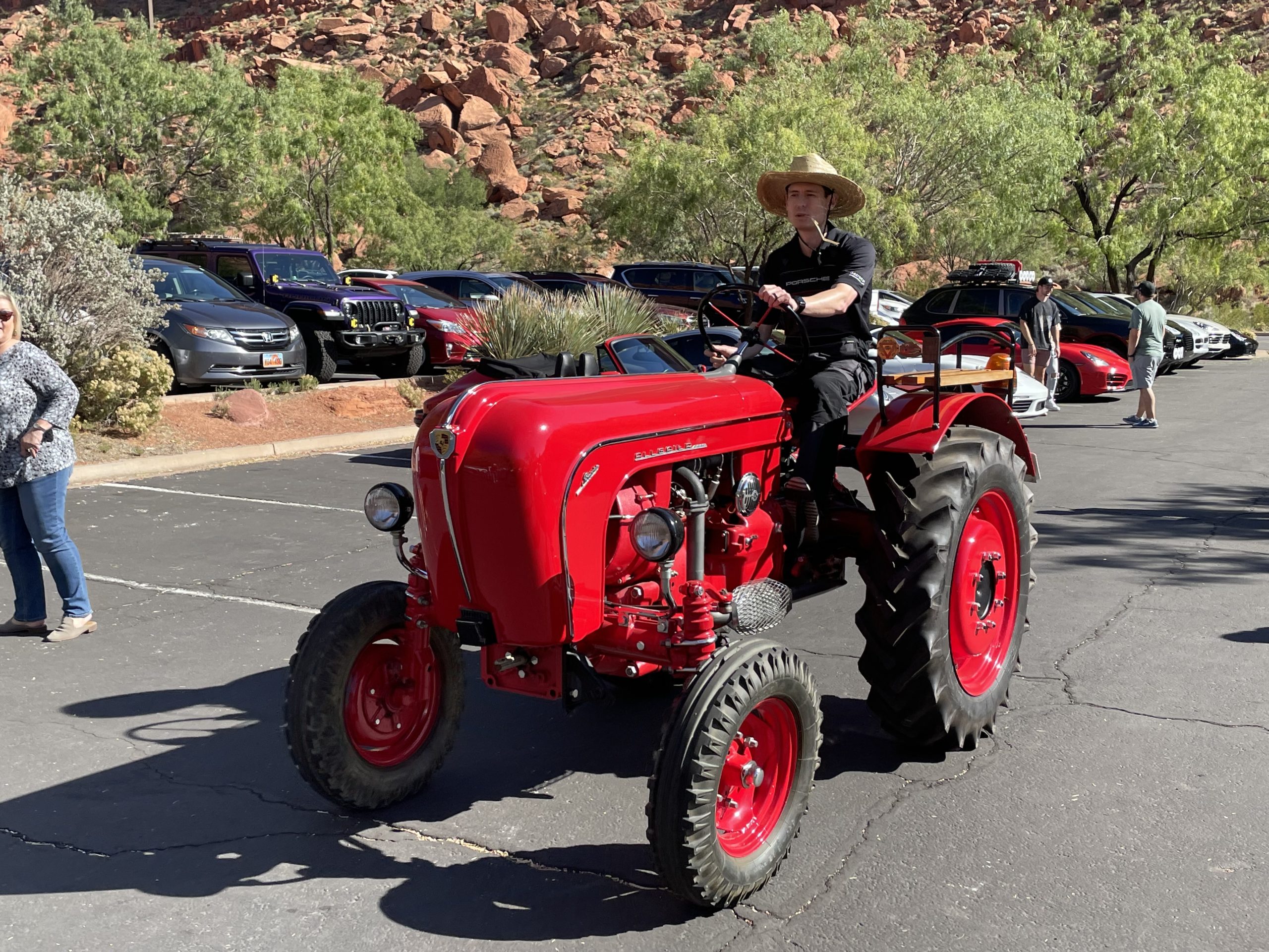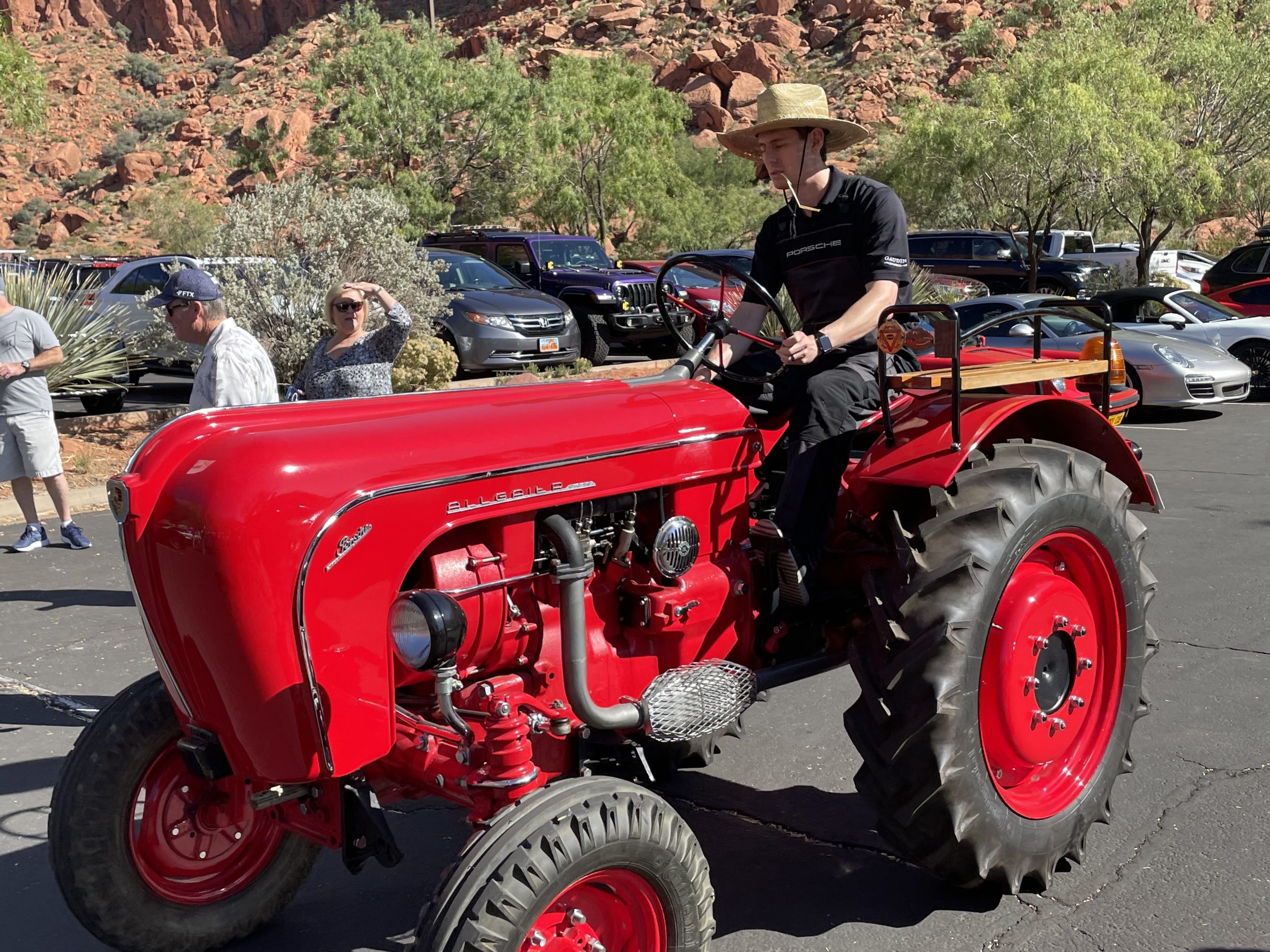 We had perfect weather for Porsches and Pastries at the scenic Tuacahn Street Market on October 21st. Dozens of Porsche owners from Southern Utah and Las Vegas were in attendance this special morning. Gaudin Porsche pulled out the stops with a harvest display complete with a Porsche tractor driven by Gaudin General Manager Paul Jarrett plowing through the parking lot like it was the south forty! They also sprung for German pastries for all.