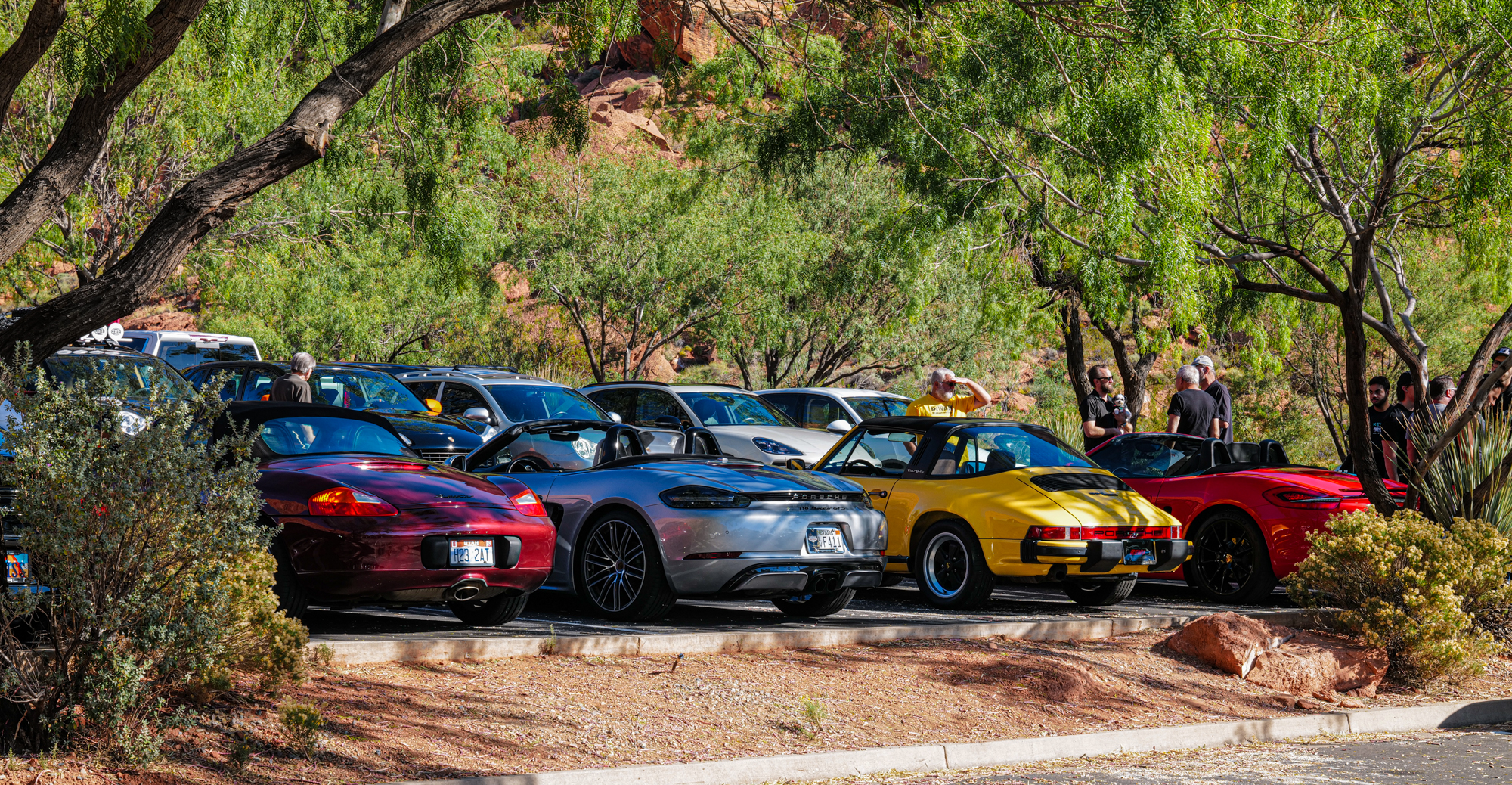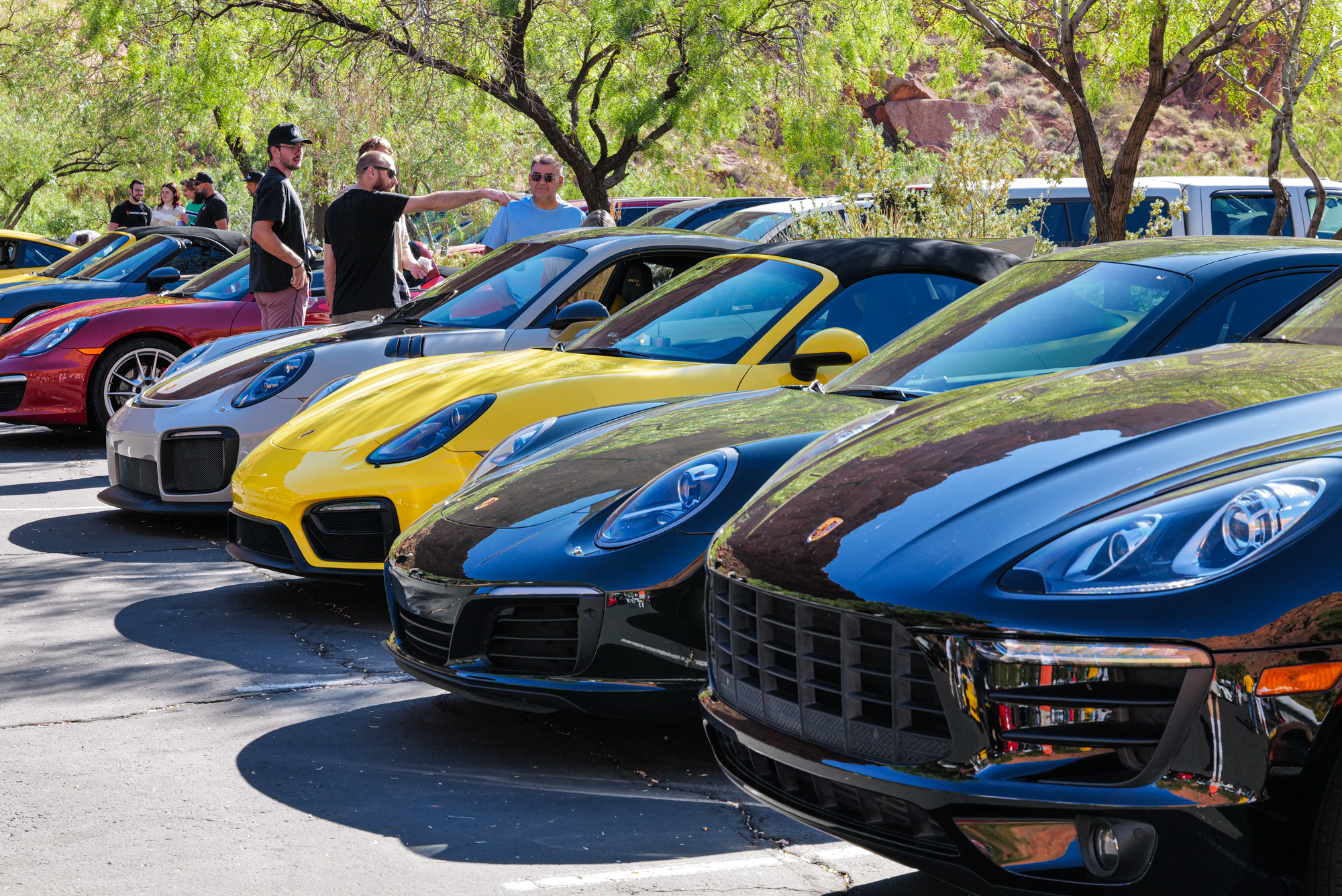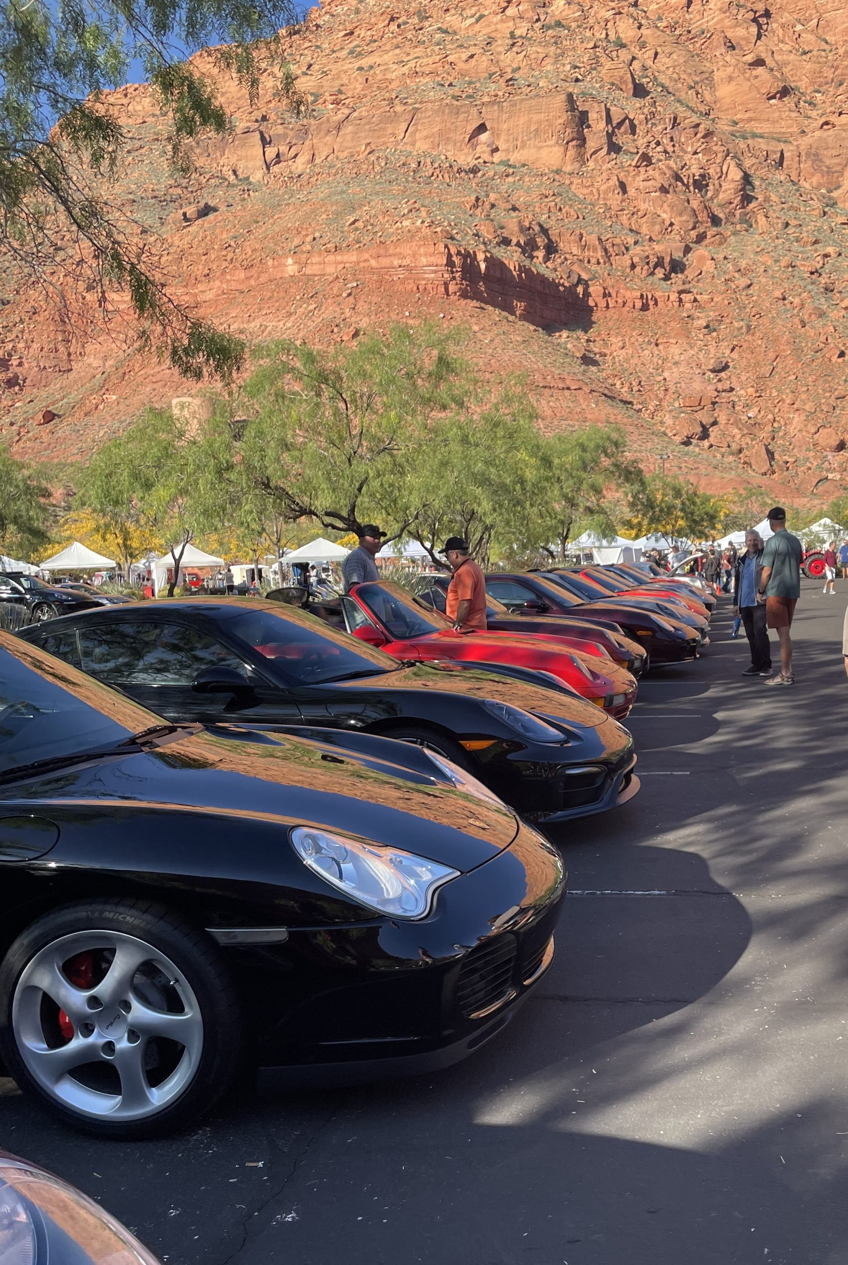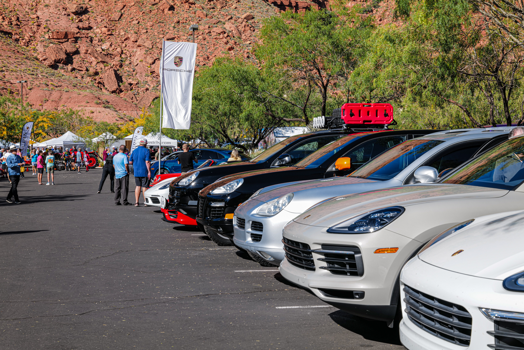 We had perfect weather for Porsches and Pastries at the scenic Tuacahn Street Market on October 21st. Dozens of Porsche owners from Southern Utah and Las Vegas were in attendance this special morning. Gaudin Porsche pulled out the stops with a harvest display complete with a Porsche tractor driven by Gaudin General Manager Paul Jarrett plowing through the parking lot like it was the south forty! They also sprung for German pastries for all.