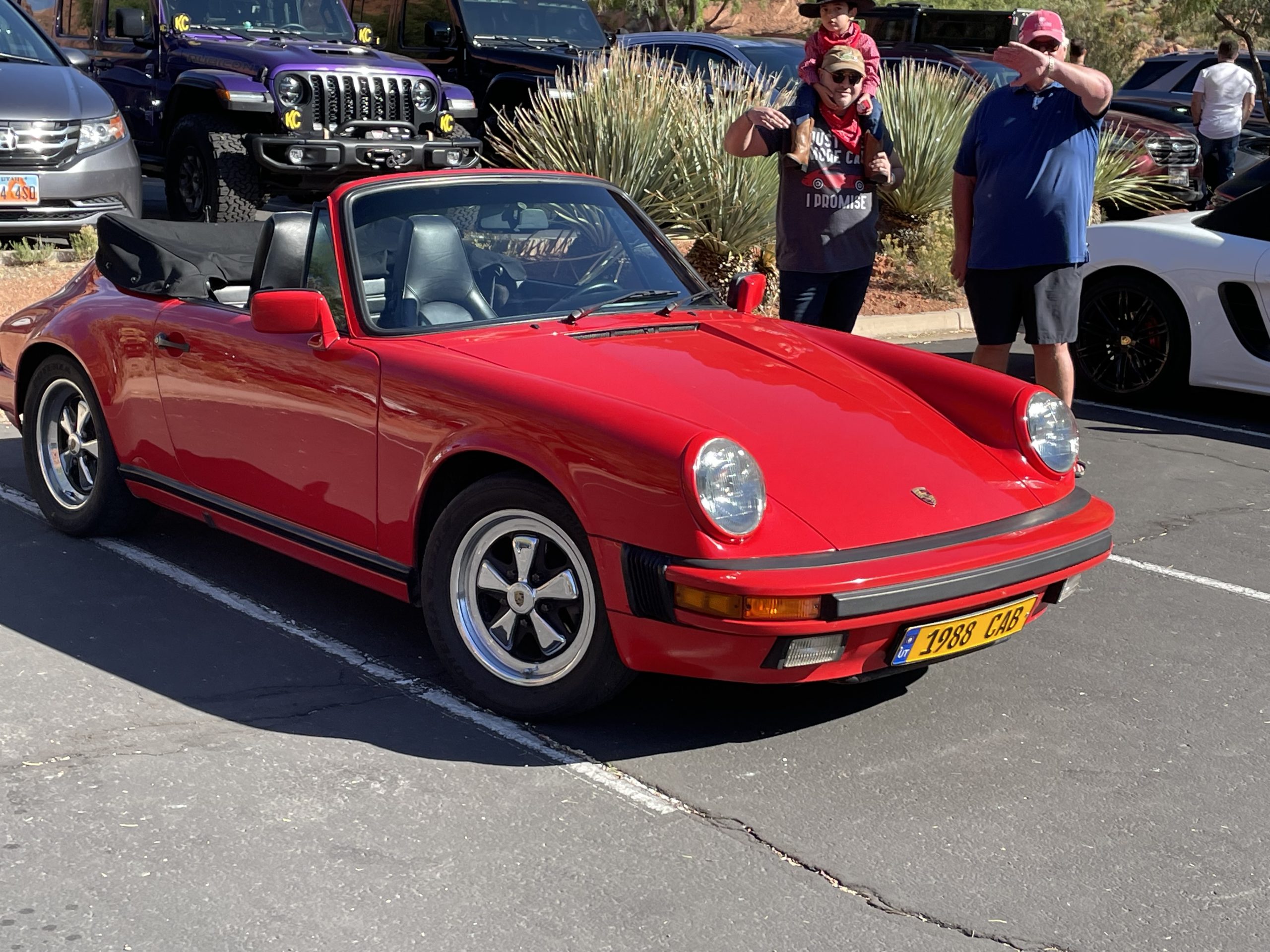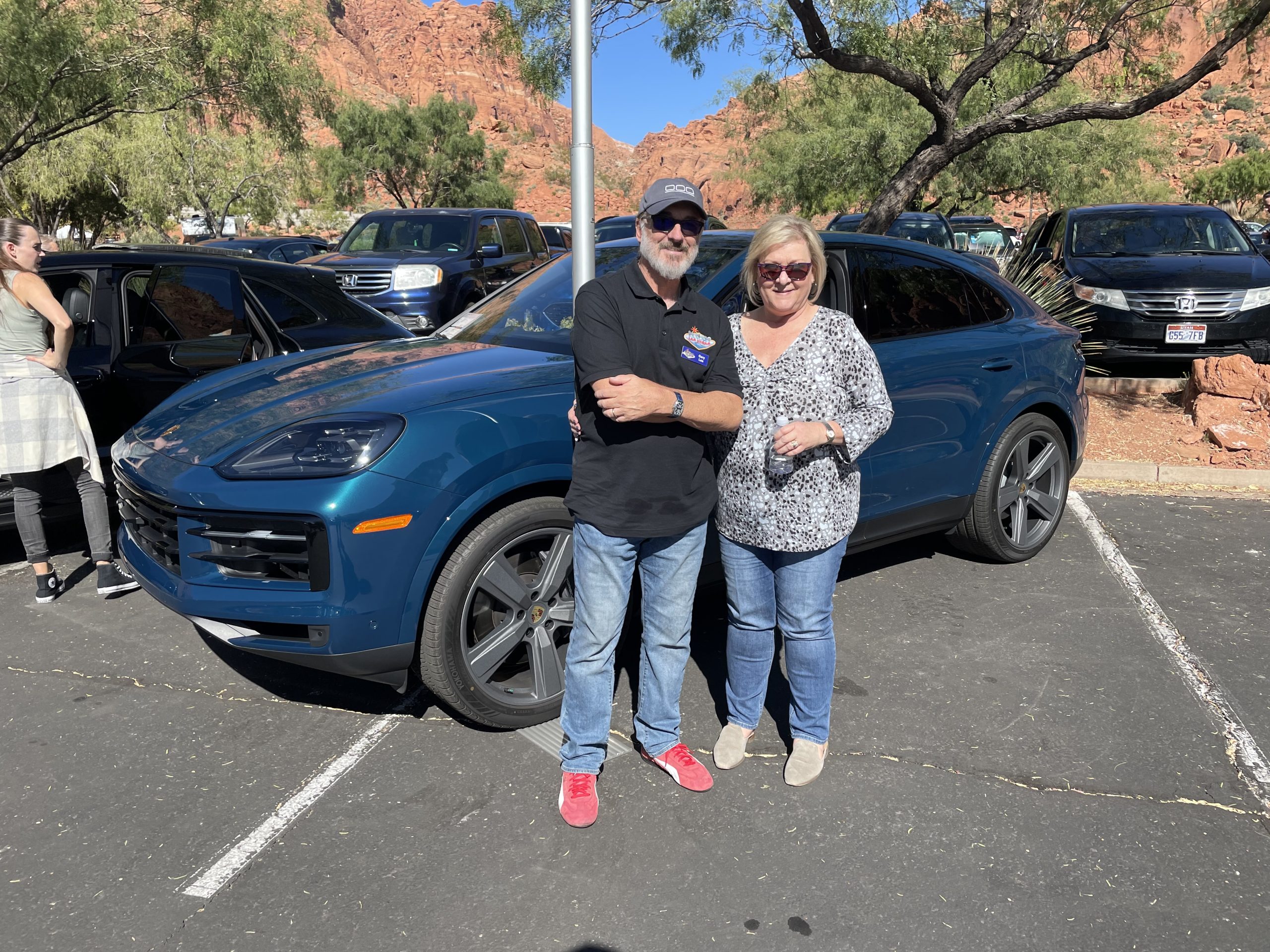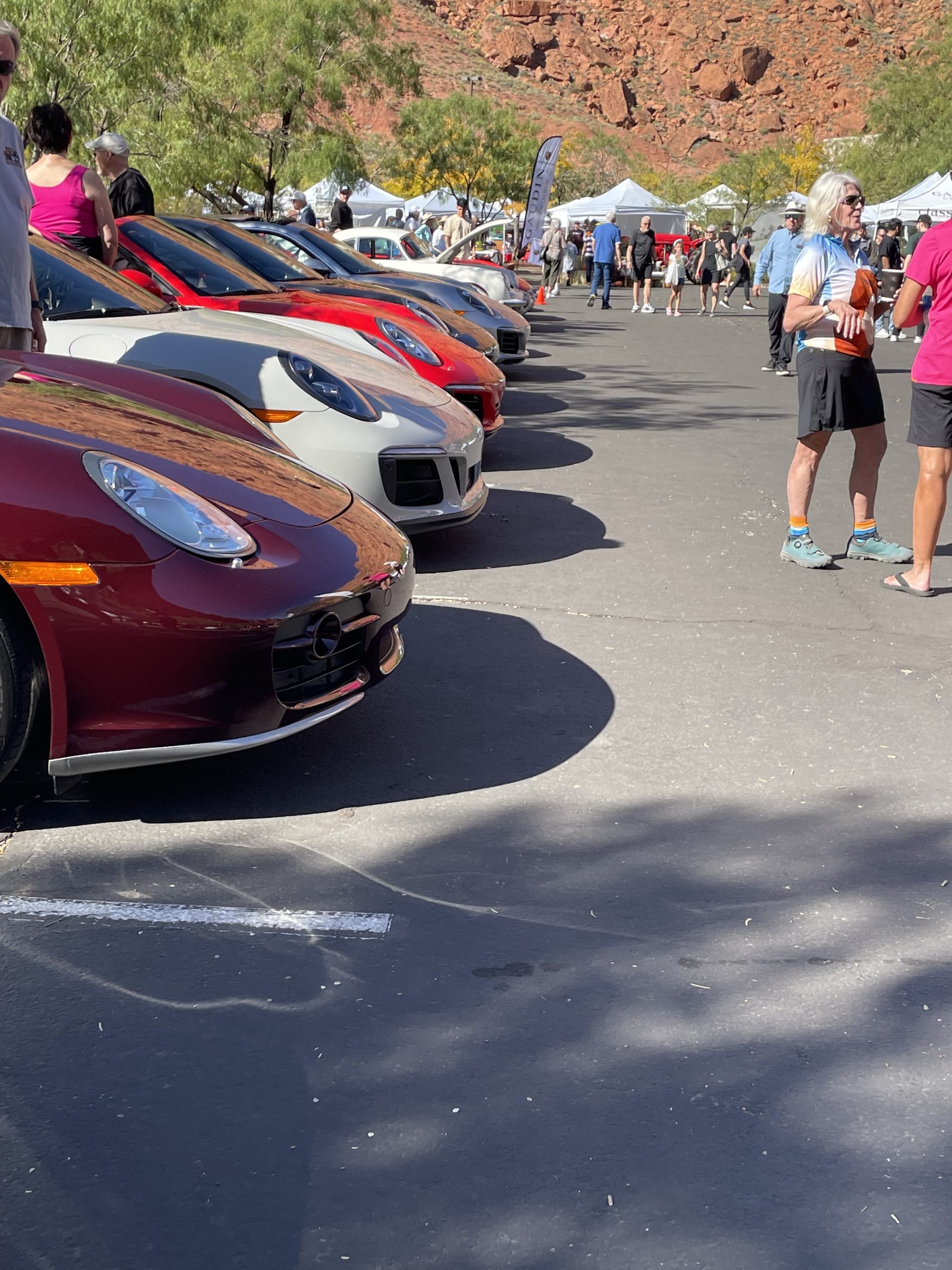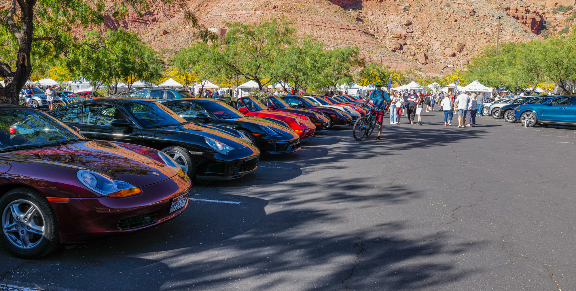 We had perfect weather for Porsches and Pastries at the scenic Tuacahn Street Market on October 21st. Dozens of Porsche owners from Southern Utah and Las Vegas were in attendance this special morning. Gaudin Porsche pulled out the stops with a harvest display complete with a Porsche tractor driven by Gaudin General Manager Paul Jarrett plowing through the parking lot like it was the south forty! They also sprung for German pastries for all.