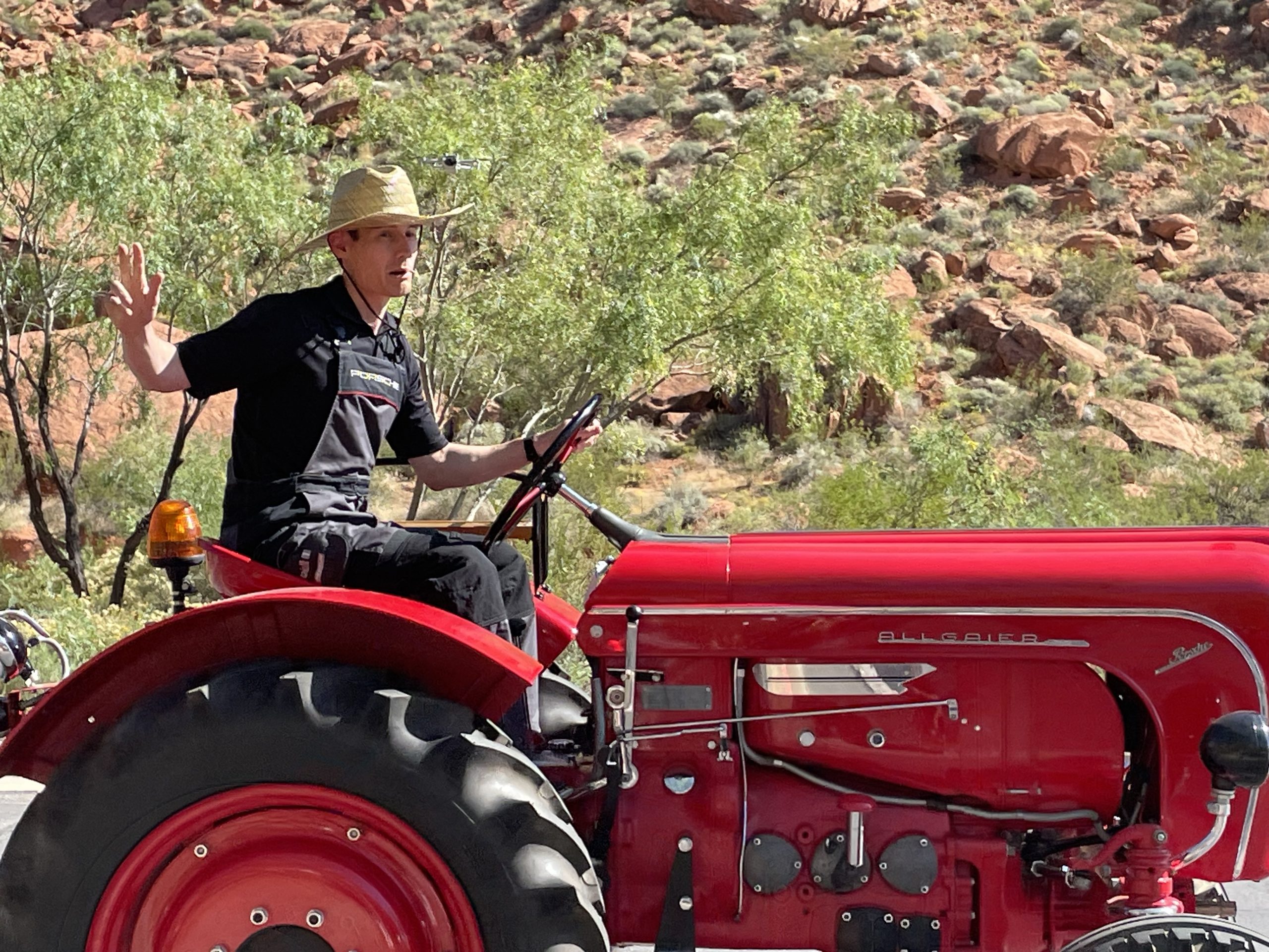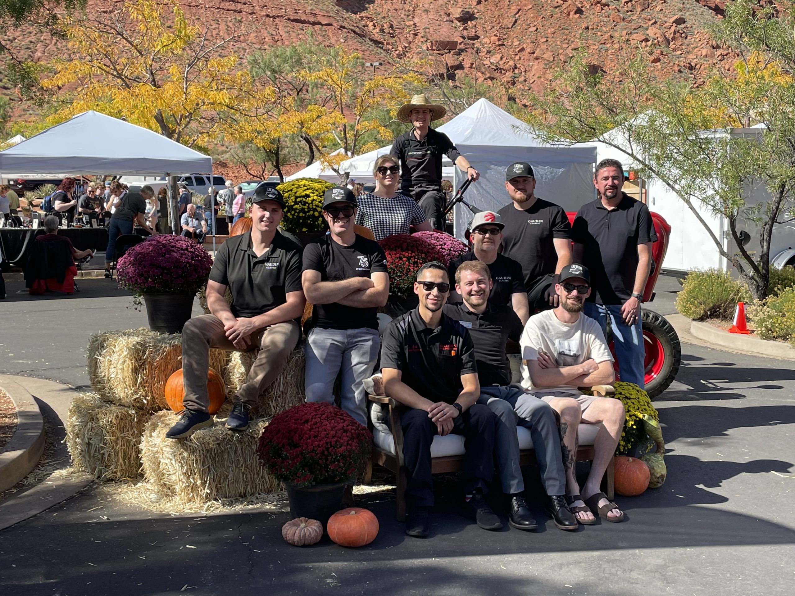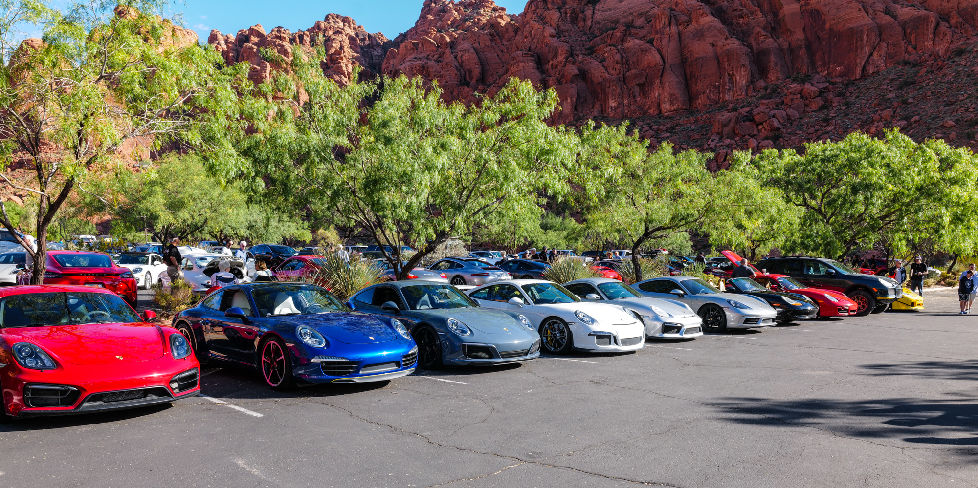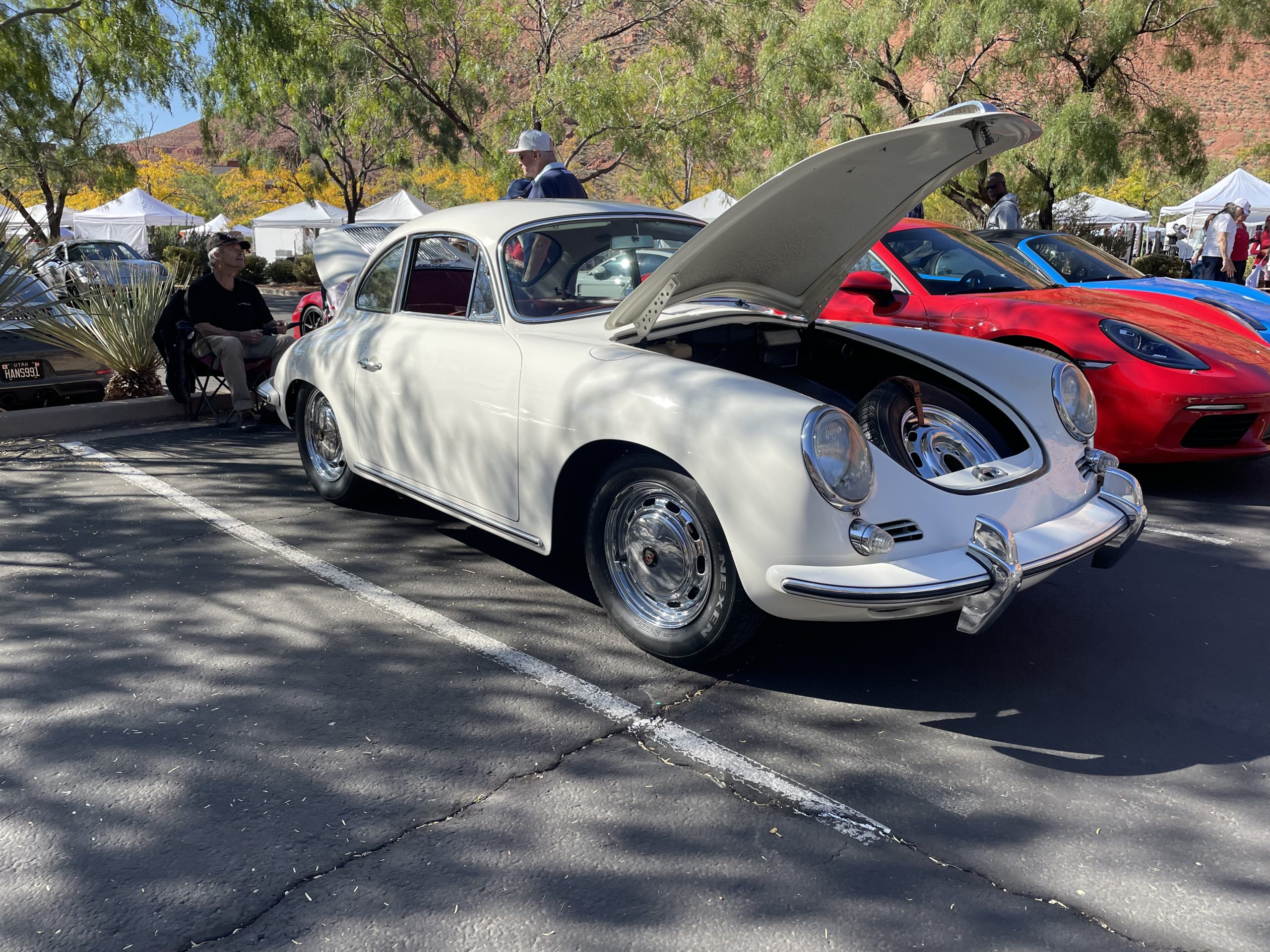 We had perfect weather for Porsches and Pastries at the scenic Tuacahn Street Market on October 21st. Dozens of Porsche owners from Southern Utah and Las Vegas were in attendance this special morning. Gaudin Porsche pulled out the stops with a harvest display complete with a Porsche tractor driven by Gaudin General Manager Paul Jarrett plowing through the parking lot like it was the south forty! They also sprung for German pastries for all.