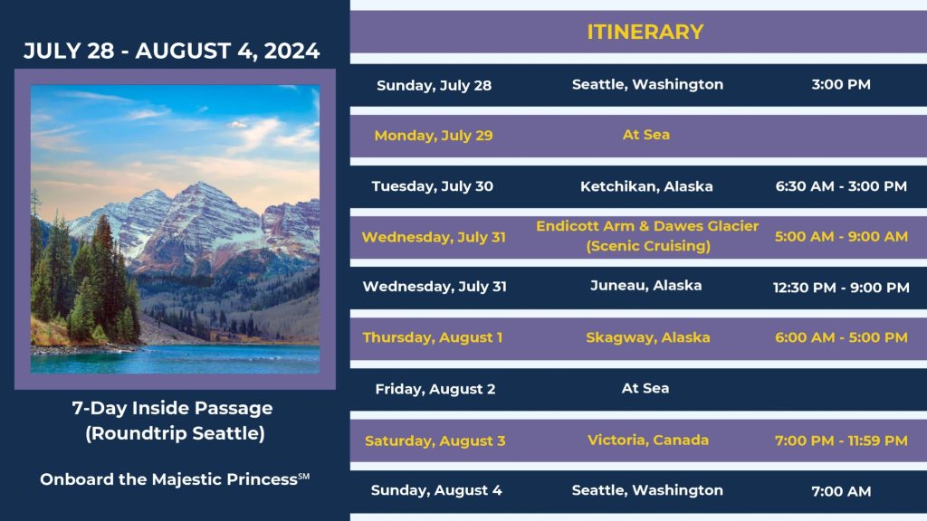 Porsche Club of America is pleased to announce that Princess Cruises will host the annual 2024 PCA Treffen at Sea! Join us as we board the Majestic Princess, one of Princess’ Royal-Class ships, for an adventure like no other. This adventure includes a seven-day voyage departing from Seattle, Washington, visiting six destinations, including Ketchikan, AK; the Endicott Arm and Dawes Glacier, Juneau, AK; Skagway, AK; and Victoria, Canada. These destinations will feature activities exclusively for PCA members, including Seminars, Group Dinners, Special Events, and Mini-Diecast Concours.