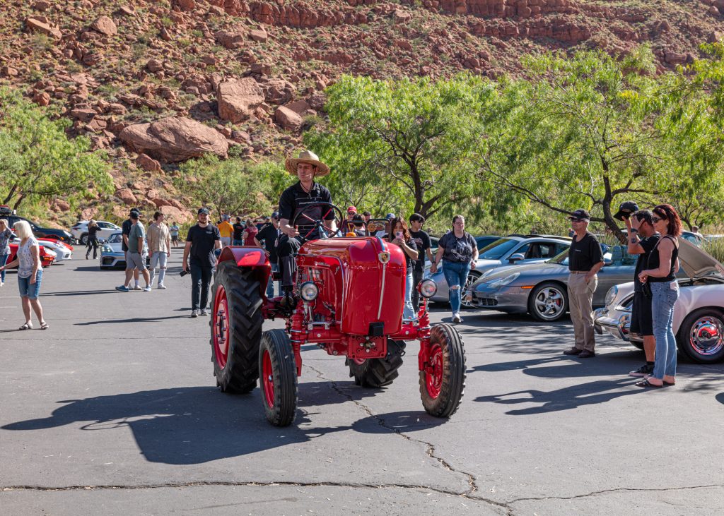 We had perfect weather for Porsches and Pastries at the scenic Tuacahn Street Market on October 21st. Dozens of Porsche owners from Southern Utah and Las Vegas were in attendance this special morning. Gaudin Porsche pulled out the stops with a harvest display complete with a Porsche tractor driven by Gaudin General Manager Paul Jarrett plowing through the parking lot like it was the south forty! They also sprung for German pastries for all.